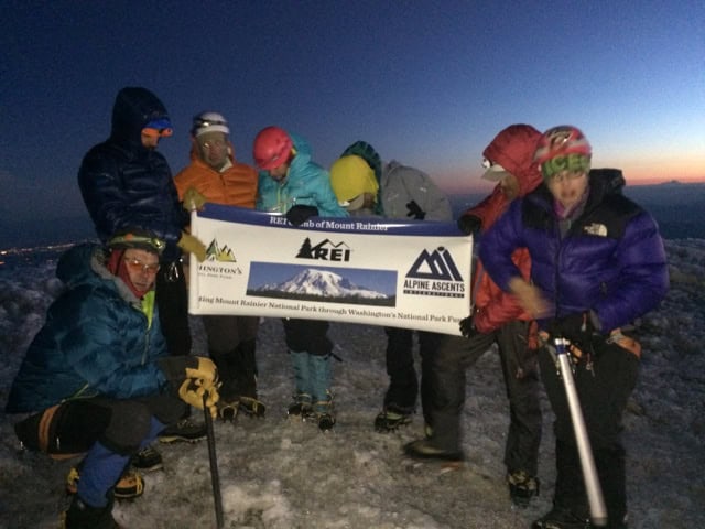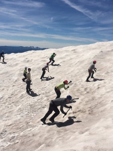 The REI climbers at Camp Muir on Friday throw themselves into self arrest practice with vigor.