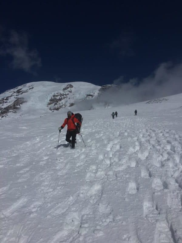 AAI Guides Peter Moore and David Gottlieb are leading their Denali Prep team down to lower elevations, this morning. Forecasts are suggesting that wind speeds will increase tonight from 15 MPH up to 60 MPH! Wisely, the group has opted to use the calmer weather to descent part way, where they will build a final camp for their last night on Mount Rainier. This practice of reading the weather mimics the decision-making process on Denali, where changes in the weather can have a drastic impact on any expedition team’s safety and comfort.