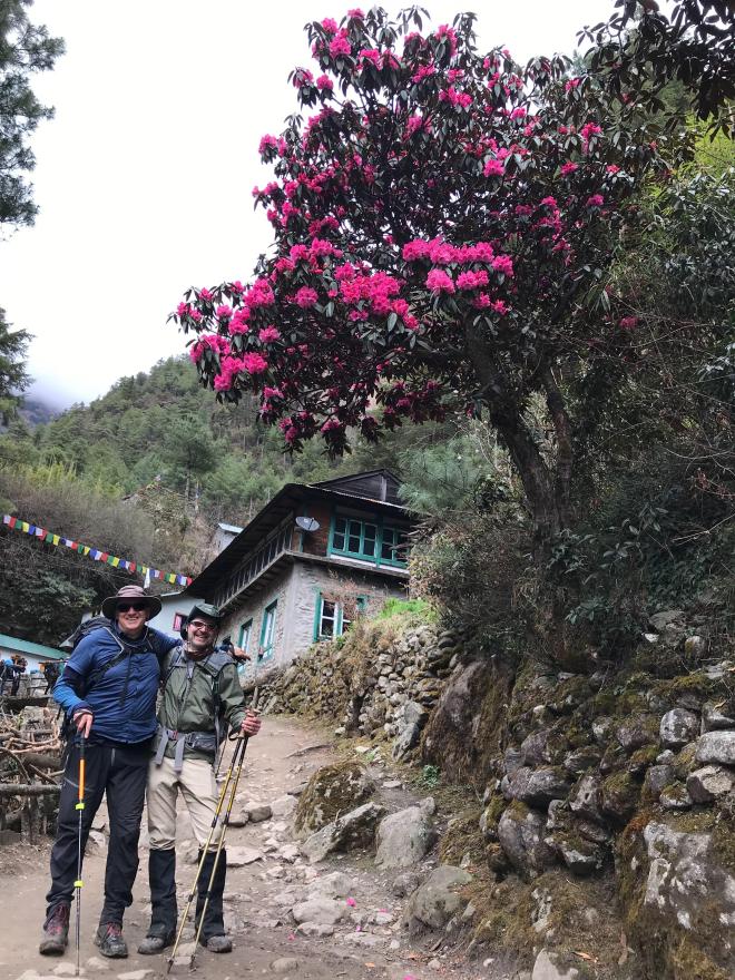 We left Namche after lunch to descend to Phakding and realized that, at these lower altitudes, Spring has Sprung. Rhododendrons blooming in pinks and reds, huge white magnolias and cherry blossoms, among others.