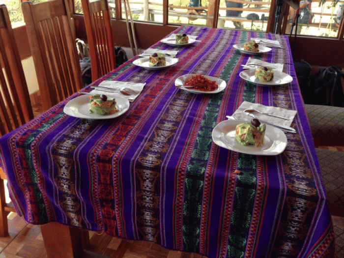 Pisco, the national beverage of Peru, is made from distilling fermented grapes and was brought to Peru from Spain in the 16th century. We learned the special recipe for the Pisco Sour and those who wished tried the cocktail while singing happy birthday to our cook. We enjoyed a light dinner followed by Rosas famous cheesecake. There is no shortage of amazing food on this trek!